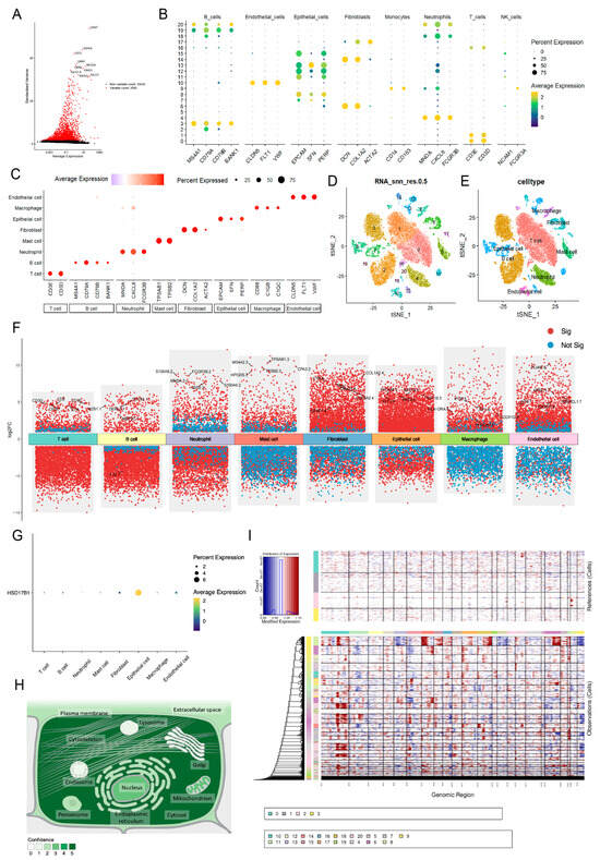 Following data filtration, a total of 28,682 cells and 27,643 genes from the GSE264203 dataset were retained for subsequent scRNA-seq analysis (Figure S4A,B). The top 2000 highly variable genes (HVGs) were selected for PCA, and the first 20 principal components (PCs) were used for further clustering analysis (Figure 8A). Thus, 21 clusters were identified and annotated into 8 cell types: mast cells, T cells, neutrophils, macrophages, fibroblasts, epithelial cells, endothelial cells, and B cells (Figure 8B–E and Figure S4C). Figure 8F illustrates the distribution of intergroup DEGs across cell types, with HSD17B1 showing predominant expression in epithelial cells (Figure 8G). Subcellular localization analysis revealed that HSD17B1 was primarily expressed in the cytosol (Figure 8H and Figure S4D). Integration of inferCNV analysis showed that epithelial cells (clusters 7, 13, and 15) exhibited pronounced copy number alterations (CNAs), suggesting potential epithelial–mesenchymal transition (EMT) within the tumor microenvironment (Figure 8I).