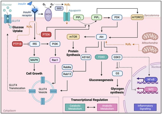 Insulin signaling pathway in skeletal muscle and role of ROS and redox sensitive systems. Insulin binds its receptor leading to activation of IRS and production of O2•− via NOX enzymes, which is dismutated by SOD to form H2O2 that can enter the cell via aquaporins. Mitochondria also produce H2O2 that participate in the insulin signaling cascade. PTP1B is a negative regulator of insulin, acting through inhibition of IRS phosphorylation. Physiological levels of H2O2 inhibit PTP1B, thereby augmenting insulin’s downstream actions on PI3K and MAPK. MAPK activation leads to cell proliferation and growth. IRS also activates PI3K which mediates many of insulin’s action on cellular metabolism. PI3K mediates the conversion of PIP2 to PIP3, which activates PDK and mTORC2 to activate Akt. H2O2 can also augment activation of Akt at physiological levels. Akt activates mTOR leading to increased protein synthesis and inhibits AS160 and GSK3 which lead to GLUT4 translocation and activation of glycogen synthase (GS) to promote glycogen synthesis. AS160 mediates GLUT4 translocation through its action on Rab8a and Rab13, which is complemented by Rac1 activation by PI3K. GSK3 is also involved in regulation of transcription factors like activation of NF-κB and Nrf2 which are involved in positive regulation of inflammatory signaling and anabolic metabolism, respectively. Akt activation also inhibits FOXO transcription factors, thereby inhibiting catabolic metabolic processes like gluconeogenesis. As shown, physiologic level of ROS are crucial for modulating both negative regulators of the insulin signaling cascade, as well as augmenting activation of key players like Akt and IR phosphorylation. Solid black arrows represent activation or phosphorylation; dashed arrows indicate conversion of molecules or processes involving translocation across the cell; orange arrows denote ROS/redox signaling; blue nodes represent key stages in insulin-dependent signaling; purple, pink, and teal nodes show transcription factors and respective boxes reflect the broad outcomes of this transcriptional regulation; dark red nodes represent negative regulators of insulin signaling.