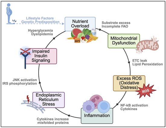 Mitochondria are a critical site where nutrient overload, redox imbalance, and impaired energy metabolism intersect in the development of insulin resistance. In the early stages of insulin resistance, nutrient excess provokes increased mitochondrial ROS production even before overt mitochondrial impairment is detectable []. Elevated fatty acid supply drives a higher electron flux through the ETC, which, when coupled with nutrient-induced uncoupling or electron leak, enhances O2•− and H2O2 generation []. These ROS can damage mitochondrial DNA, respiratory chain proteins, and metabolic enzymes, progressively diminishing mitochondrial oxidative capacity.