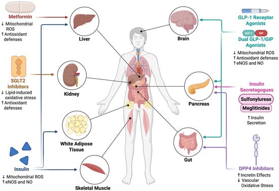Systemic sites of action of type II diabetes therapies and their redox implications. Antidiabetic drug classes act across multiple tissues to regulate glucose homeostasis whilst influencing redox balance and ROS generation. Biguanides (metformin, dark red) act primarily on the liver and muscle to modulate Complex I activity, AMPK signaling, and antioxidant defenses. Insulin (blue) lowers glucose-induced oxidative distress and enhances NO-dependent vascular signaling. SGLT2 inhibitors (gold) act on the kidney but secondarily improve lipid handling, mitochondrial remodeling, and antioxidant capacity in skeletal muscle. Insulin secretagogues (sulfonylureas, meglitinides, pink) increase insulin secretion, indirectly affecting redox balance. Incretin-based therapies (GLP-1 receptor agonists, dual GLP-1/GIP agonists, and DPP-4 inhibitors, teal and lavender) exert multisystem effects, including improved mitochondrial biogenesis, reduced ROS production, and enhanced vascular perfusion. Arrows denote the primary organ(s) targeted by each therapy. Each class of drug’s mechanism of action on target organ(s) is/are discussed in depth in the main body text.