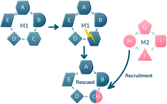 The loss of an essential enzyme in M1 (red cross) creates a metabolic bottleneck. This failure leads to the recruitment of an enzyme from M2, whose latent moonlighting activity allows it to compensate for the missing enzyme. Thereby, flux through M1 is restored. Figure 1 and Figure 2 show the two mechanisms proposed as the origin of a number of moonlighting proteins.