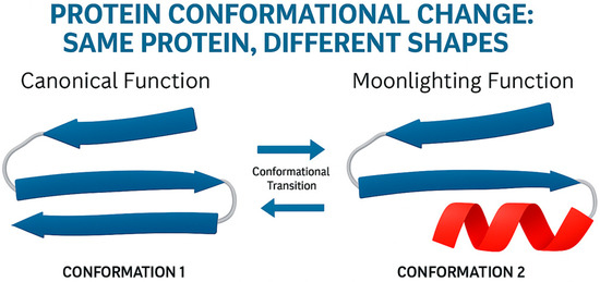 This mechanism highlights that moonlighting can arise not only from changes in protein–protein interactions or localization, but from the very plasticity of the polypeptide chain itself. The existence of such proteins challenges the classical “one sequence, one structure, one function” paradigm and supports the view that structural dynamics are central to functional versatility.