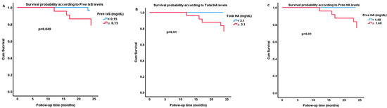 Log-rank tests were run to determine if there were differences in the clinical events distribution (cardiovascular events, hospitalization due to infection, and all-cause mortality) for the PBUTs that were examined. Kaplan–Meier survival analysis tests found that patients’ survival was significantly different when they were clustered based on median levels of free IxS, total HA, and free HA (Figure 1).