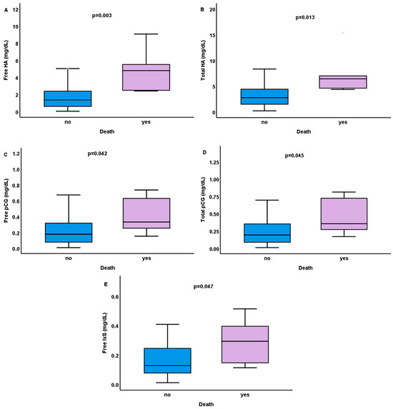 Moreover, no significant correlations were found between pCS and IAA levels with mortality in this study. A logistic regression model, describing the effect of each PBUT on death probability could explain 44% (Nagelkerke R2) of the variance in death and correctly classified 90.7% of cases. Patients with increased levels of free IxS and total and free HA were more likely to die within a 2-year follow-up period (p = 0.047, p = 0.013, p = 0.003, respectively). In patients who died during the follow-up period (n = 6, 11.11%, all of them in the second year), increased levels, compared to those remained alive, of total HA 6.42 (4.54–9.08) vs. 2.75 (1.46–4.49) mg/dL (p = 0.007); free HA 4.79 (2.47–6.4) vs. 1.36 (0.58–2.43) mg/dL (p = 0.004); free IxS 0.29 (0.14–0.42) vs. 0.13 (0.08–0.24) mg/dL (p = 0.045); total pCG 0.35 (0.25–0.74) vs. 0.19 (0.08–0.37) mg/dL (p = 0.045); free pCG 0.33 (0.23–0.65) vs. 0.18 (0.08–0.33) mg/dL (p = 0.042), were found, respectively (Figure 2). However, in these patients, increased levels of total pCS 1.34 (1.13–1.62) vs. 1.21 (0.8–1.68) mg/dL and free pCS 0.11 (0.08–0.25) vs. 0.08 (0.05–0.12) were also found, but were not statistically significant (p = 0.457, p = 0.16, respectively).