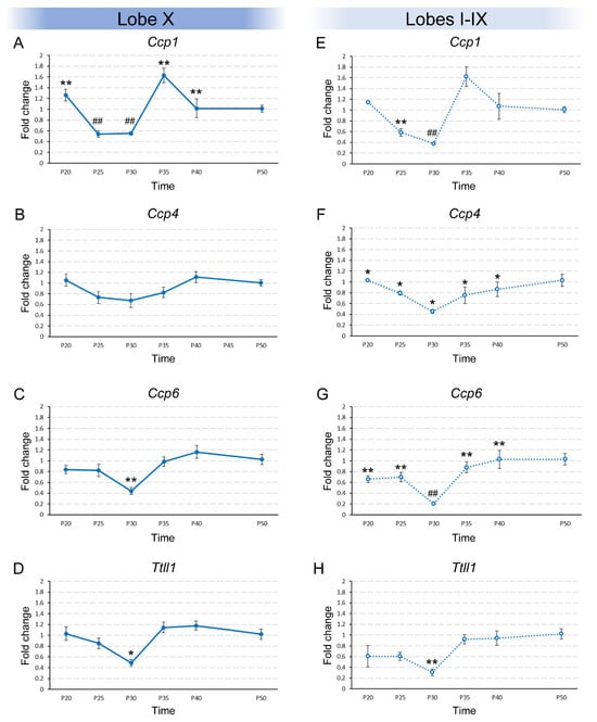 Temporal expression of Ccp1, Ccp4, Ccp6, and Ttll1 in vermis of wild-type animals from P20 to P50. Results are separated in lobe X ((A–D), continuous lines) and lobes I-IX ((E–H), dashed lines). (A) Significant differences in Ccp1 expression in lobe X were observed over time. (B) No significant differences were observed over time for Ccp4 and extremely low expression levels were detected (CT around 32). (C,D) The same expression pattern was observed in lobe X for both Ccp6 and Ttll1, with significant differences. (E) Ccp1 expression in lobes I-IX decreased progressively, and then rose back to initial levels, remaining stable. (F) Ccp4 expression remained constant from P20 to P40, and at P50 showed a distinct expression level. (G) Ccp6 expression slightly decreased at P30 and then returned to initial levels at P35 and P40, and increased again at P50. (H) Ttll1 expression decreased at P30 and then rose back to initial levels. Data are presented as mean fold change ± standard error of the mean. When Kruskal–Wallis indicated significance, step-down post hoc comparisons defined the most likely subsets; P50 was considered the reference level of gene expression; equal symbols indicate statistically similar groups; * p < 0.05; ** or ## p < 0.01.