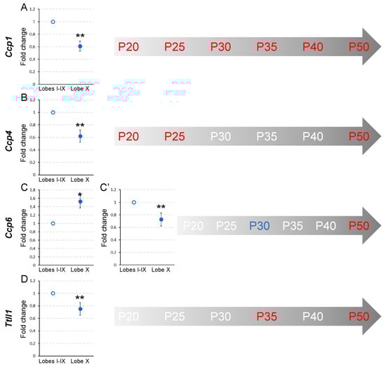 Comparison of Ccp1, Ccp4, Ccp6, and Ttll1 expression between lobe X and the rest of the vermis in wild-type mice from P20 to P50. Charts show a representative example of the fold change in each gene at different ages. In the timelines (gray arrows) those ages at which statistical differences were found are colored in red (a decrease in gene expression for lobe X in comparison with the rest of the vermis) or blue (an increase in gene expression for lobe X). (A) The expression of Ccp1 was lower in lobe X compared to the other lobes, from P20 to P50. (B) Ccp4 presented a lower expression in lobe X compared to the other lobes at P20, P25 and P50. (C,C’) The expression of Ccp6 fluctuated more: at P30 (C), it was higher in lobe X than in the other lobes; conversely, at P50 (C’) lobe X presented a lower gene transcription. (D) Ttll1 presented lower gene expression in lobe X at P35 and P50. Note that the expression of Ccp1 was always reduced in lobe X, and that at P50 all the analyzed genes presented a lower production in lobe X. Data are presented as mean fold change ± standard error of the mean. * p < 0.05; ** p < 0.01.