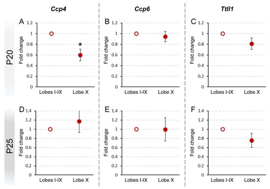 Comparison of Ccp4, Ccp6, and Ttll1 expression between lobe X and the rest of the vermis in PCD at P20 and P25. Significant differences were found only in the expression of Ccp4 at P20 (A), which appeared reduced in lobe X. The other genes did not show differences either at P20 (B,C) or P25 (D–F). Data are presented as mean fold change ± standard error of the mean. * p < 0.05.