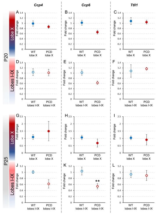 To confirm whether the pcd mutation affected the expression of Ccp4, Ccp6 and Ttll1, the fold changes in these genes were calculated by comparing their expression in lobe X and the rest of the lobes in PCD mice with that of wild-type, both at P20 and at P25 (Figure 4).