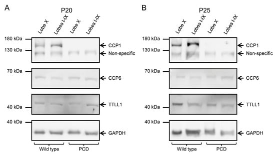 To confirm the results obtained from qPCR, we performed Western blot analyses to examine protein levels, as mRNA levels do not necessarily correspond to protein abundance. At P20, we observed the presence of CCP1 in wild-type animals and its absence in PCD animals in all cerebellar lobes (Figure 5A; Supplementary Figure S3A,A’). CCP6 and TTLL1 appeared in both tissues and genotypes (Figure 5A; Supplementary Figure S3B,B’). Our results were similar at P25: CCP1, CCP6 and TTLL1 were present in wild-type mice, while only CCP6 and TTLL1 were detected in PCD mice (Figure 5B; Supplementary Figure S3). Note that GAPDH band of PCD mice at P25 has a lower intensity than the wild-type one due to the ongoing process of cell death, which also compromises general protein expression.