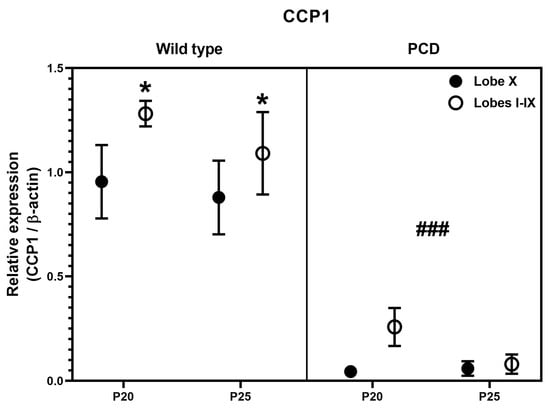 Quantification of CCP1 expression after Western blot analyses in wild-type and PCD mice at P20 and P25, comparing lobe X and the rest of cerebellum. Statistically significant differences were detected for both genotype and cerebellar region. * p < 0.01 for region, ### p < 0.01 for genotype, general differences after three-way ANOVA analysis.