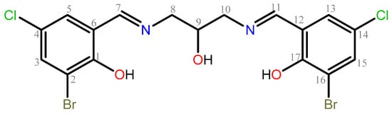 To a 100 mL round-bottom flask were added 0.09095 g (1 mmol) of 2-hydroxy-1,3-propanediamine and 0.4706 g (2 mmol) of 3-bromo-5-chloro-2-hydroxybenzaldehyde in 40 mL of ethanol (EtOH). The reaction mixture was stirred at room temperature for 3 h. During this time, the solution gradually developed a yellow color, indicating the formation of a Schiff base. After completion of the reaction, the solvent was partially evaporated under reduced pressure to approximately half of the original volume, and the mixture was left to stand at room temperature. Upon standing, yellow single crystals suitable for X-ray diffraction analysis were formed by slow evaporation of ethanol at RT. The product, as yellow crystals, was filtered off and dried (0.2695 g, 98%). Elemental analysis for C17H14Br2Cl2N2O3 (525.02 g·mol−1): Found: C, 38.92; H, 2.70; N, 5.32; Calc.: C, 38.89; H, 2.69; N, 5.34%. Selected FT-IR (cm−1): 3254 (νOH), 3061, 2927 (νOH···N), 1637 (νC=N), 1133 (νC-O). 1H NMR (400 MHz, DMSO-d6) δ 14.64 (1;17) (s, 1H), 8.52 (7;11) (s, 1H), 7.71 (5;13) (dd, J = 2.6, 0.09 Hz, 1H), 7.5 (3;15) (d, J = 2.6 Hz, 1H), 5.64 (9 (O-H)) (d, J = 5.2 Hz, 1H), 4.06 (9) (tt, J = 7.6, 3.7 Hz, 1H), 3.83 (8;10) (dd, J = 12.9, 3.9 Hz, 1H), 3.62 (8;10) (dd, J = 12.8, 6.9 Hz, 1H) 13C NMR (101 MHz, DMSO-d6) δ 166.48 (7;11), 163.20 (1;17), 135.61 (3;15), 130.99 (5;13), 118.06 (4;14), 117.01 (6;12), 114.59 (2;16), 68.07 (9), 58.19 (8;11). ESI-MS: m/z 525 [C17H13Br2Cl2N2O3]− 100%; 1084 [(C17H14Br2Cl2N2O3)2Cl]−.