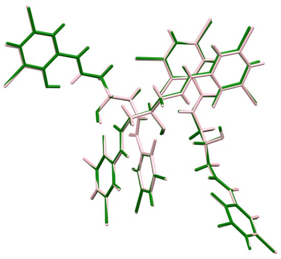 The molecular overlay of compound 1,3-bis(3-bromo-5-chlorosalicylideneamino)-2-propanol, H3L (green), and 1,3-bis(3,5-dibromosalicylideneamino)-2-propanol (pink).