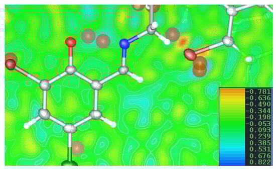Quite a detailed structural analysis of the molecular structure of 1,3-bis(3,5-dibromosalicylideneamino)-2-propanol has been described earlier [], so, due to the almost perfect isostructurality, this discussion will not be repeated here. The crystal packing in 1,3-bis(3-bromo-5-chlorosalicylideneamino)-2-propanol is mostly determined by quite strong O-H··· hydrogen bonds and, to some extent, also by the stacking interactions between substituted aromatic rings. Additionally, there are weak C-H···Br and C-H···π hydrogen-bond-like interactions, which may also influence the arrangement of molecules in the crystal lattice. The geometry of selected hydrogen bonds has been summarized in Table 1, Table S2; the others can be found in the Supplementary Materials, together with bond distances, valence angles, and torsion angles for all three molecules of 1,3-bis(3-bromo-5-chlorosalicylideneamino)-2-propanol (Figure S2).
