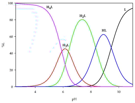 Analysis of these protonation constants revealed that the first deprotonation occurs at pH below 4.0 and is assigned to one of the phenolic groups, followed by subsequent protonation/deprotonation steps involving the second phenolic oxygen, hydroxyl group, and nitrogen atom. Subsequently, the obtained set of protonation constants was used to generate theoretical distribution diagrams of H3L species as a function of pH, providing detailed insight into the speciation profile and relative stability of the different forms of the ligand (Figure 4).