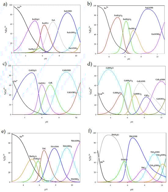 Distribution diagram of the complexes formed in the studied systems with 1,3-bis(3-bromo-5-chlorosalicylideneamino)-2-propanol and lanthanide(III) ions: (a) Eu(III) (1:1 ratio); (b) Eu(III) (1:2 ratio); (c) Gd(III) (1:1 ratio); (d) Gd(III) (1:2 ratio); (e) Tb(III) (1:1 ratio); (f) Tb(III) (1:2 ratio).