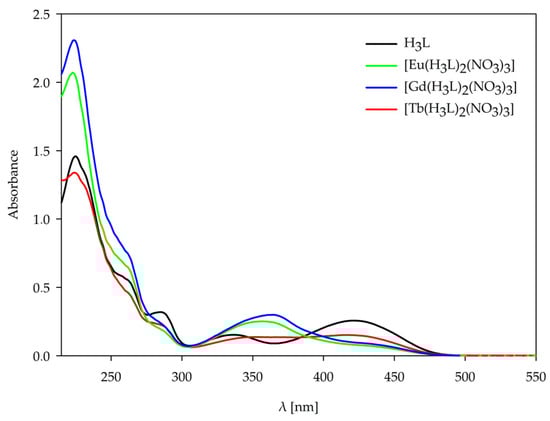 UV-Vis spectra of solid-state H3L ligand and its complexes with Eu(III), Gd(III), and Tb(III).