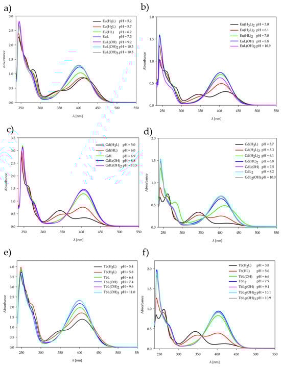 All forms of complexes formed in solution at the pH value of dominance of each form, determined by potentiometric titration, were studied by the UV-Vis spectra. For all the complexes forming in the solution, a decrease in the number of characteristic bands was observed with increasing pH values of the systems. Upon complex formation, the two higher-energy bands of the free ligand merge into a single band. The band shift, the emergence of new bands, and the variation in molar absorptivity (ε) provide evidence for the coordination of metal ions with ligands and the resulting complex formation []. Changes are observed above 350 nm, i.e., in the range of occurrence of characteristic bands assigned to the n-π* transition of the C=N group, for both Ln(III)–ligand 1:1 and 1:2 systems. The change in this characteristic band pattern is caused by deprotonation of the ligand with increasing pH, which correlates with a change in the internal structure of the coordination sphere. Absorption in the spectra can be ascribed to the organic ligands, as the contribution of lanthanide(III) ions is negligible owing to the Laporte-forbidden nature of their electronic transitions.