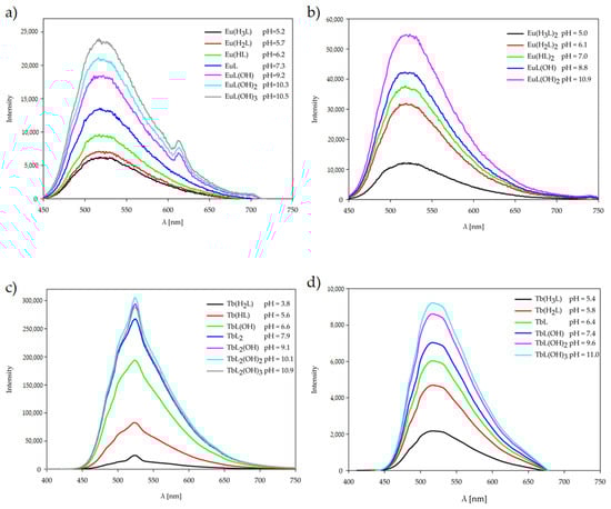 A photoluminescence study of the ligand and its Eu(III) and Tb(III) complexes has been carried out in solution at the pH value of dominance of each form, determined by potentiometric titration, at room temperature, Figure 8. Upon excitation into the UV region, the luminescence spectrum of the H3L ligand in solution displays broad emission bands with maxima at 529 nm for the protonated H4L form of ligand (pH 4.0), 518 nm for the neutral H3L form (pH 6.0), 519 nm, 523 nm, and 517 nm for the deprotonated H2L form (pH 7.2), HL (pH 9.0), and L (pH 10.5), respectively. Luminescence studies also have been carried out, giving the emission spectra of complexes Eu(III) and Tb(III) upon excitation at 243 nm at the pH value where each form of complexes predominates. Eu(III) complexes exhibit the main emission centered around 523–516 nm, while Tb(III) complexes at around 525–515 nm, which may be caused by ligand π-π* transition. Lanthanide(III) ions present in the systems increase the luminescence of the H3L ligand. The enhancement value depends on the type of Ln(III) ion, but also on the deprotonation of the ligand, which depends on the pH of the tested solution. The Eu(III) complex solutions showed a very weak emission band at approximately 613 nm, attributed to the 5D0–7F2 transitions. This band is visible for complexes forming at pH above 9.2 and only for the stoichiometric ratio Ln(III):H3L 1:1. The results of our luminescence experiments show that low efficiency of energy transfer within the molecule occurs only in Eu(III) complexes. No transfer of energy was observed in Tb(III) complexes at any pH value. The probable cause is the large energy difference between the lowest energy level of the H3L ligand triplet state and the lowest resonant energy level of the Ln(III) ions studied [].