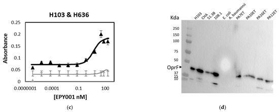 EPY001 mAb specifically binds to OprF protein from P. aeruginosa. (a) ELISA binding curves of EPY001 to OprF-reconstituted proteoliposomes; (b) binding affinity of EPY001 to whole cells of Wild-Type (WT) P. aeruginosa strains CHA and its corresponding OprF-deficient mutants CHAΔOprF; (c) binding affinity of EPY001 to whole cells of WT P. aeruginosa strains H103 and its corresponding OprF-deficient mutants H636. Kd values were determined using nonlinear regression analysis (one site—specific binding) in GraphPad Prism v9.2.0. All data are representative of at least three independent experiments; (d) Western blot analysis of whole-cell lysates using EPY001 as the primary antibody (IgG2a), followed by a horseradish peroxidase (HRP)-conjugated goat anti-mouse IgG secondary antibody.
