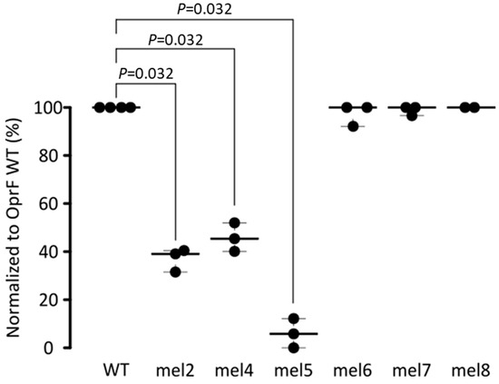 - Woodruff, W.A.; Hancock, R.E. Construction and characterization of Pseudomonas aeruginosa protein F-deficient mutants after in vitro and in vivo insertion mutagenesis of the cloned gene. J. Bacteriol. 1988, 170, 2592–2598. [Google Scholar] [CrossRef]
