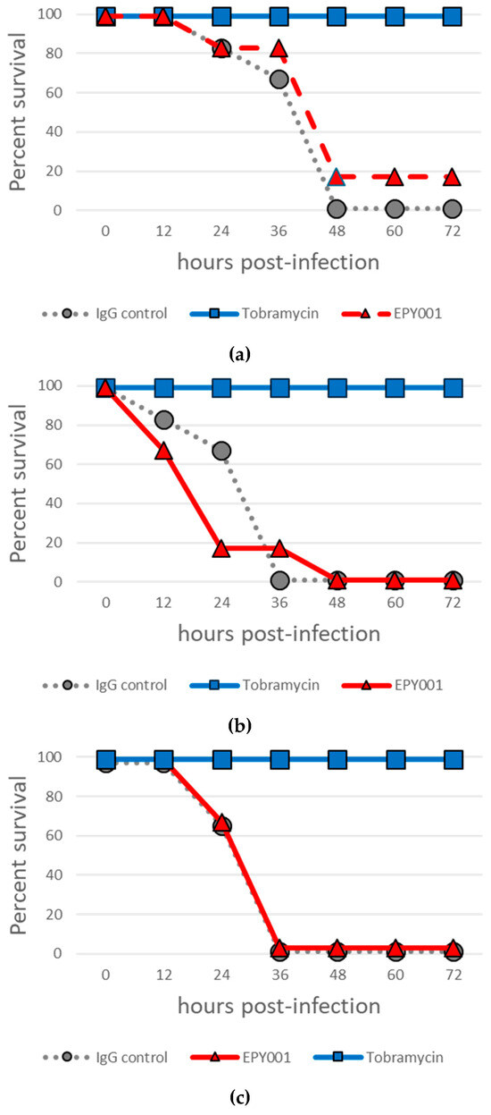 Passive immunization with EPY001 fails to confer protection in a murine model of acute P. aeruginosa pneumonia. C57BL/6J mice (n = 6 per group) were challenged via the orotracheal route with 50 µL of a bacterial suspension containing 1 × 108 CFU/mL of P. aeruginosa CHA strain (final dose: 5 × 106 CFU per lung). Three independent survival experiments were performed over a 3-day period: (a) curative setting—EPY001 (20 mg/kg), control IgG (20 mg/kg), or tobramycin (20 mg/kg) were administered intraperitoneally after infection; (b) prophylactic setting—same treatment groups, with antibodies/antibiotic administered intraperitoneally 1 h before infection; (c) pre-opsonization setting—bacteria were pre-incubated with EPY001 for 1 h prior to orotracheal infection, while control IgG and tobramycin were administered intraperitoneally. Survival was monitored for 72 h post-infection.