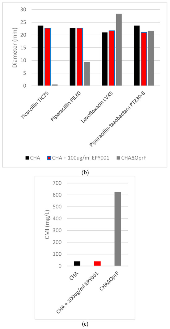 Effect of the EPY001 antibody on antibiotic susceptibility of P. aeruginosa CHA. (a) Disk diffusion antibiogram comparing P. aeruginosa CHA and CHAΔOprF. The amounts of each antibiotic are indicated on the texte in µg. For example Levofloxacin LVX5 indicates 5 µg; (b) disk diffusion antibiogram comparing Ticarcillin, Piperacillin, Levofloxacin, and Piperacillin/Tazobactam against CHA, CHA treated with 100 µg/mL of the EPY001 antibody, and CHAΔOprF; (c) minimum inhibitory concentration (MIC) of Ticarcillin determined by microdilution for CHA alone, CHA + EPY001 (100 µg/mL), and CHAΔOprF.