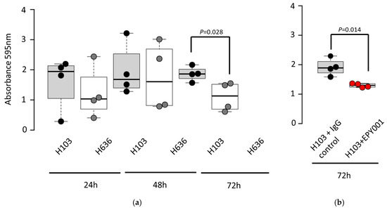 EPY001 antibody reduces P. aeruginosa H103 biofilm formation. (a) Biofilm formation by WT H103 and its ΔOprF mutant H636 was measured over 72 h using crystal violet (CV) staining; statistical significance was assessed using the bilateral Mann–Whitney test, with p-values < 0.05 considered significant; (b) biofilms of H103 were grown for 72 h in the presence of EPY001 or a control antibody (100 µg/mL); a one-tailed Mann–Whitney test was used because we had an a priori hypothesis that the anti-OprF antibody would specifically reduce biofilm production compared to the control with p-values < 0.05 considered significant. Experiments were independently repeated four times.