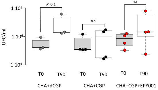 CDC activity of the EPY001 mAb against P. aeruginosa CHA strain. Bacterial viability was assessed after incubation of the CHA strain in LB medium under three conditions: (1) with dCGP, (2) with CGP, and (3) with CGP supplemented with EPY001 (50 µg/mL). Bacterial counts were measured at T0 and after 90 min of incubation (T90). Data represent three independent experiments. Statistical comparisons between T0 and T90 were performed using the Mann–Whitney U test; p-value ≤ 0.05 was considered statistically significant; n.s, for not significant.