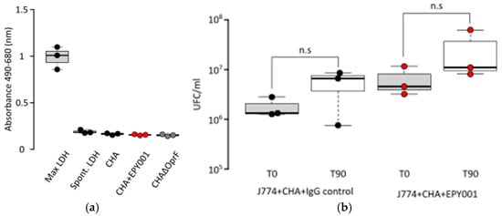 Results showed that LDH levels in the presence of CHA were similar to those observed in spontaneous cell lysis controls, indicating no cytotoxicity of the CHA strain toward J774.1 macrophages. This first experiment validated the use of J774.1 cells for subsequent ADCP assays. To test for ADCP activity, bacteria were incubated with J774.1 macrophages in the presence of either EPY001 or a control anti-lysozyme antibody (100 µg/mL) for 90 min (Figure 8b). The number of non-phagocytosed bacteria remaining in the supernatant was quantified. No decrease in extracellular bacterial counts was observed for both antibody conditions relative to the initial inoculum. EPY001 did not reduce the number of extracellular bacteria compared to the control antibody. These results indicate that EPY001 does not promote phagocytic uptake by J774.1 macrophages.