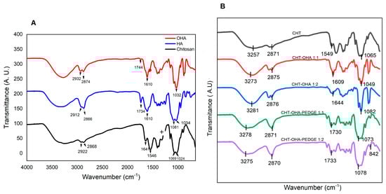FTIR spectra of (A) chitosan (CHT), hyaluronic acid (HA), and oxidized hyaluronic acid (OHA). (B) Chitosan/oxidized hyaluronic acid (CHT-OHA) blends and CHT/OHA-PEGDE-crosslinked.