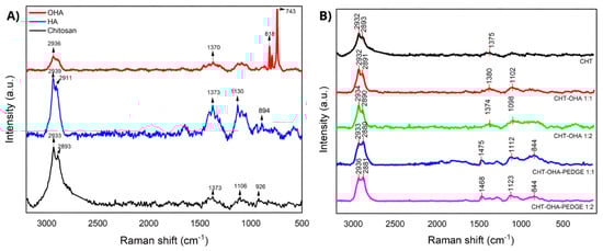 Raman spectra of (A) chitosan (CHT), hyaluronic acid (HA), and oxidized hyaluronic acid (OHA). (B) Chitosan/oxidized hyaluronic acid (CHT-OHA) blends and chitosan/oxidized hyaluronic acid (CHT-OHA) PEGDE-crosslinked sponges.