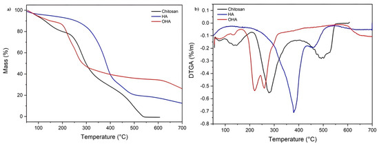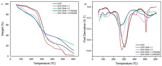 Figure 3 presents TGA and DTGA thermograms of chitosan (CHT), hyaluronic acid, and oxidized hyaluronic acid (Figure 3a–c) and blends of chitosan/oxidized hyaluronic acid (CHT-OHA 1:1), (CHT-OHA 1:2), blends of chitosan/oxidized hyaluronic acid crosslinked with polyethylene glycol diglycidyl ether (CHT-OHA 1:1-PEGDE), and (CHT-OHA 1:2-PEGDE) in Figure 3c,d.