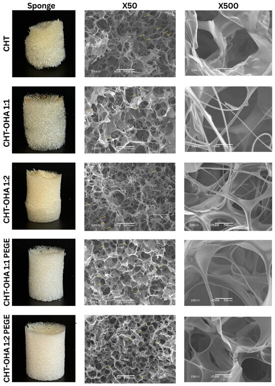 SEM analysis confirmed that all chitosan sponges subjected to different treatments (OHA and PEGDE) exhibited a three-dimensional network structure, highlighting an interconnected porous surface. The average theoretical pore diameter in chitosan and oxidized hyaluronic acid sponges ranged from ~97 to 231 μm (see Figure 4), encompassing the interval ~116 to 131 μm observed in sponges crosslinked with PEGDE. These quantitative estimations, derived from calibrated SEM micrographs and supported by experimental porosity data (92.8–95.0%), are consistent with previously reported values for chitosan–hyaluronic acid systems, confirming the robustness and reliability of the morphological analysis.