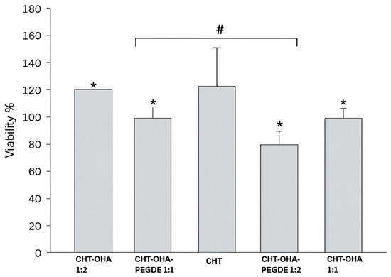 Viability of fibroblasts in direct contact with chitosan/oxidized hyaluronic acid (CHT-OHA 1:1), (CHT-OHA 1:2), and mixtures of chitosan/sodium hyaluronate/polyethylene glycol diglycidyl ether (CHT-OHA-PEGDE 1:1) and (CHT-OHA-PEGDE 1:2). Values represent mean ± SD (n = 3). Asterisks (*) indicate significant differences (p < 0.05) compared to the control (CHT). # = significant difference between groups (p < 0.05).