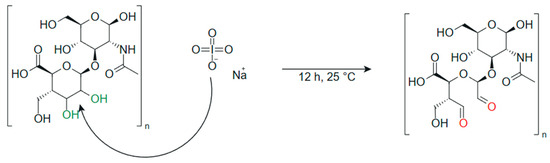 Oxidation of hyaluronic acid (HA) with sodium periodate to produce oxidized hyaluronic acid (OHA) containing aldehyde groups. Hydroxyl groups involved in the oxidation reaction are highlighted in green, and the newly formed aldehyde groups are shown in red.