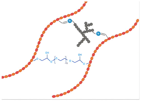Crosslinking mechanism between chitosan (CHT), oxidized hyaluronic acid (OHA), and PEGDE, showing the formation of imine and covalent bonds within the three-dimensional polymeric network.
