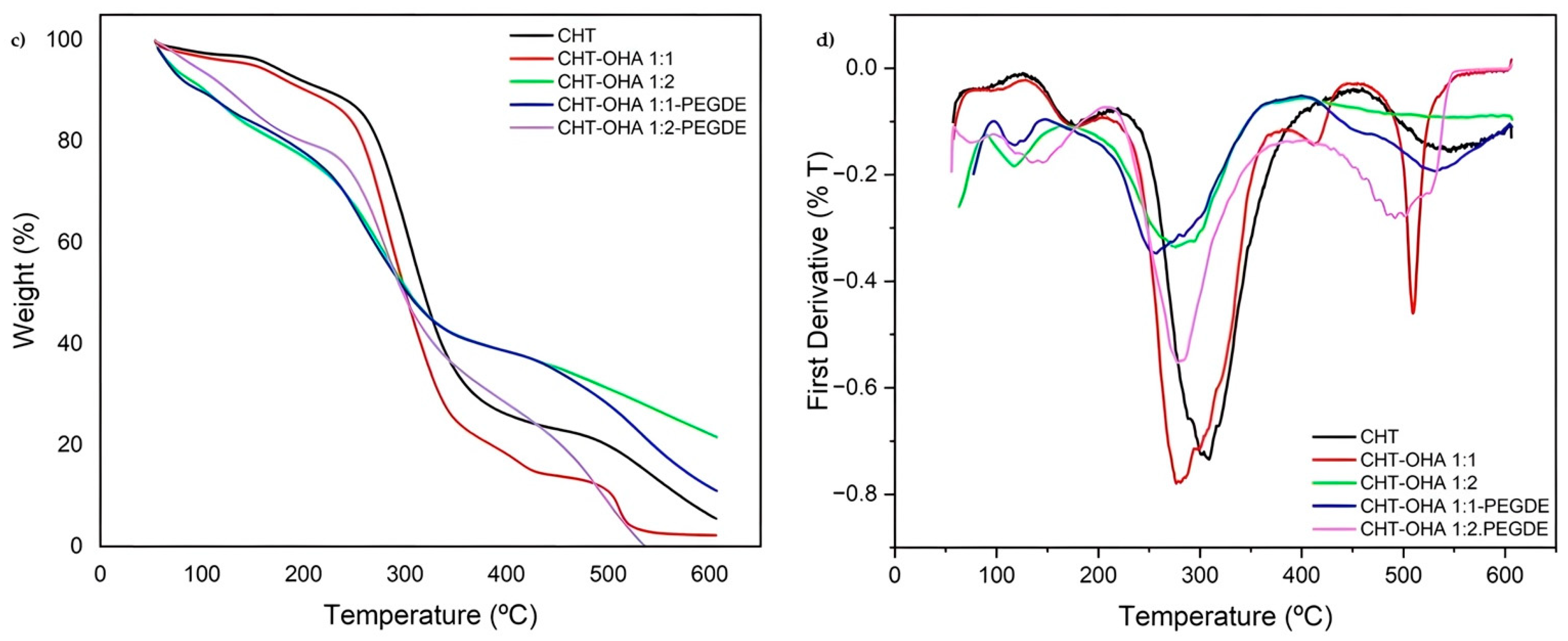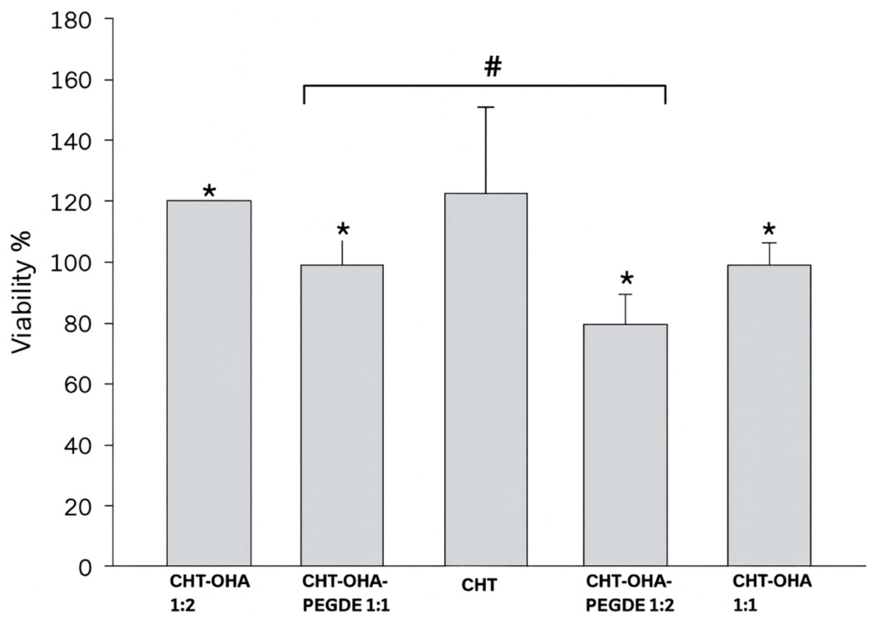 | CHT-OHA-PEGDE 1:2 | Chitosan + OHA + PEGDE (1:2) | 74 ± 9 | p < 0.05 | Slightly lower viability; within ISO 10993-5 range |