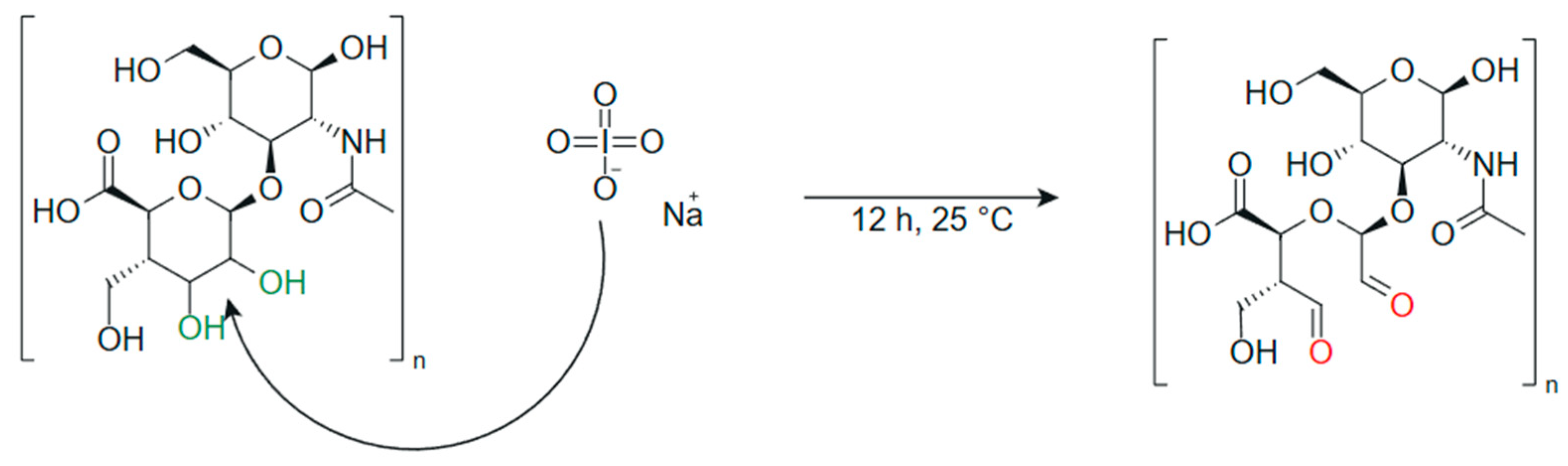 - Pandit, A.H.; Mazumdar, N.; Ahmad, S. Periodate oxidized hyaluronic acid-based hydrogel scaffolds for tissue engineering applications. Int. J. Biol. Macromol. 2019, 137, 853–869. [Google Scholar] [CrossRef]