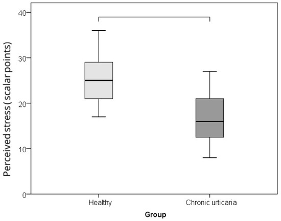 Comparison between healthy controls and CSU patients for perceived stress levels (horizontal lines denote significant differences between groups).