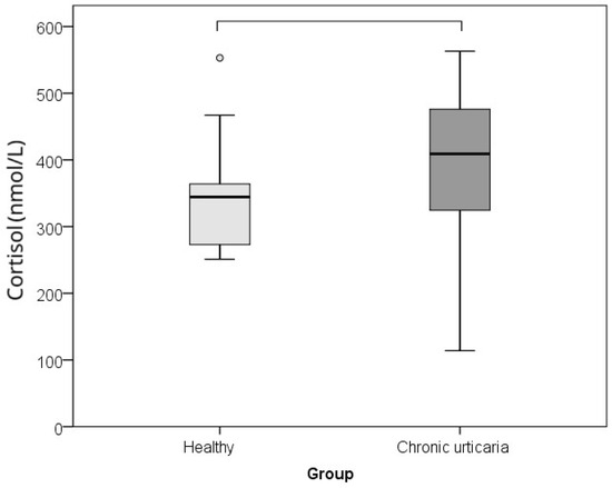 Comparison between healthy controls and CSU patients for serum cortisol values (horizontal lines denote significant differences between groups; circles represent outliers).