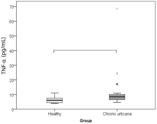 Comparison between healthy controls and CSU patients for serum TNF-α levels (horizontal lines denote significant differences between groups; circles represent outliers and stars extremes).