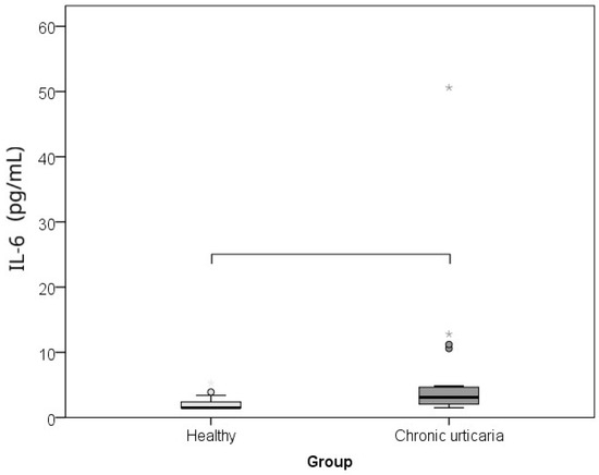 Comparison between healthy controls and CSU patients for serum IL-6 values (horizontal lines denote significant differences between groups; circles represent outliers and stars extremes).