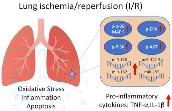 Schematic representation of the proposed interactions between oxidative stress, kinase activation, and microRNA (miRNA) expression during lung ischemia/reperfusion (I/R) injury. Oxidative stress leads to the activation (phosphorylation) of p-38 mitogen-activated protein kinase (p-38 MAPK), extracellular signal-regulated kinase (ERK), phosphoinositide 3-kinase (PI3K), and protein kinase B (AKT), which may influence the expression of specific miRNAs (miR-126, miR-142-5p, miR-152, and miR-155) involved in inflammatory and vascular responses. The red arrow indicates upregulation of the depicted elements.
