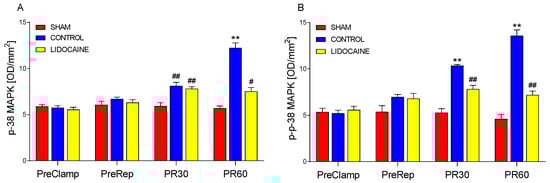 Levels of p-38 MAPK (A) and phosphorylated p-38 MAPK (p-p38 MAPK) (B) in lung biopsies collected at four time points: PreClamp (before ischemia), PreRep (before reperfusion), PR30 (30 min after reperfusion), and PR60 (60 min after reperfusion) (n = 6 per group). Data represent mean ± SEM. Within each time point, red bars indicate sham-operated animals, blue bars control animals, and yellow bars lidocaine-treated animals. ** p < 0.001 vs. both sham and lidocaine; # p < 0.01 or ## p < 0.001 vs. sham. Results are presented in optical density per mm2 (OD/mm2).