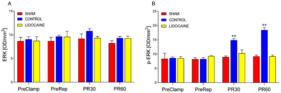 Levels of ERK (A) and phosphorylated ERK (p-ERK) (B) in lung biopsies collected at four time points: PreClamp (before ischemia), PreRep (before reperfusion), PR30 (30 min after reperfusion), and PR60 (60 min after reperfusion) (n = 6 per group). Data represent mean ± SEM. Within each time point, red bars indicate sham-operated animals, blue bars control animals, and yellow bars lidocaine-treated animals. ** p < 0.001 vs. both sham and lidocaine. Results are presented in optical density per mm2 (OD/mm2).