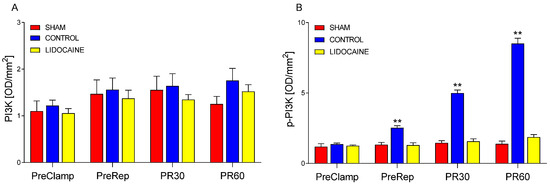 Levels of PI3K (A) and phosphorylated PI3K (p-PI3K) (B) in lung biopsies collected at four time points: PreClamp (before ischemia), PreRep (before reperfusion), PR30 (30 min after reperfusion), and PR60 (60 min after reperfusion) (n = 6 per group). Data represent mean ± SEM. Within each time point, red bars indicate sham-operated animals, blue bars control animals, and yellow bars lidocaine-treated animals. ** p < 0.001 vs. both sham and lidocaine. Results are presented in optical density per mm2 (OD/mm2).