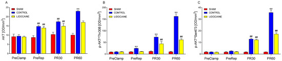 Levels of AKT (A), phosphorylated AKT^Thr308 (p-AKT^Thr308) (B), and phosphorylated AKT^Ser473 (p-AKT^Ser473) (C) in lung biopsies collected at four time points: PreClamp (before ischemia), PreRep (before reperfusion), PR30 (30 min after reperfusion), and PR60 (60 min after reperfusion) (n = 6 per group). Data represent mean ± SEM. Within each time point, red bars indicate sham-operated animals, blue bars control animals, and yellow bars lidocaine-treated animals. ** p < 0.001 vs. both sham and lidocaine; ## p < 0.001 vs. sham. Results are presented in optical density per mm2 (OD/mm2).