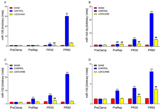 Relative expression of miR-126 (A), miR-142-5p (B), miR-152 (C), and miR-155 (D) in lung biopsies collected at four time points: PreClamp (before ischemia), PreRep (before reperfusion), PR30 (30 min after reperfusion), and PR60 (60 min after reperfusion) (n = 6 per group). Data represent mean ± SEM. Within each time point, red bars indicate sham-operated animals, blue bars control animals, and yellow bars lidocaine-treated animals. ** p < 0.001 vs. both sham and lidocaine; ## p < 0.001 vs. sham. Expression levels are presented in arbitrary units.