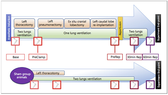 Schematic representation of the experimental surgical procedure and sampling time points. Base, baseline; PreClamp, before ischemia, i.e., before pulmonary artery clamping; PreRep, before reperfusion; 30 min Rep, 30 min after reperfusion; 60 min Rep, 60 min after reperfusion.