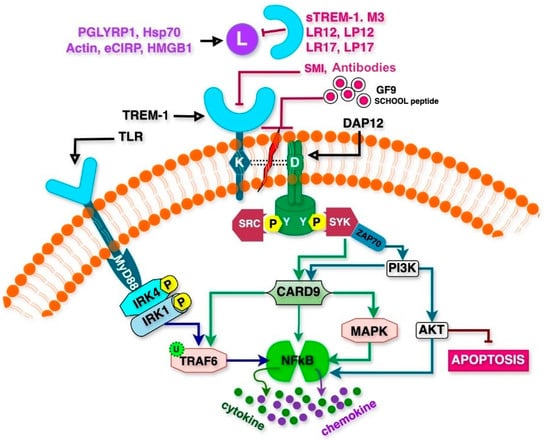 - Shen, Z.T.; Sigalov, A.B. Rationally designed ligand-independent peptide inhibitors of TREM-1 ameliorate collagen-induced arthritis. J. Cell Mol. Med. 2017, 21, 2524–2534. [Google Scholar] [CrossRef]